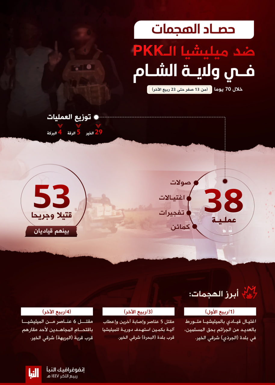 داعش در این اینفوگرافیک مدعی شد که ۳۸ عملیات شامل حمله مستقیم، ترور، انفجار بمب و کمین را بین ۱۳ صفر ۱۴۴۷ (۱۶ مرداد ۱۴۰۴) تا ۲۳ ربیع الاخر ۱۴۴۷ (۲۴ مهر ۱۴۰۴) در سه استان دیرالزور، حسکه و رقه علیه نیروهای قسد به انجام رسانیده است. این آمار نشان میدهد که داعش به طور متوسط در شرق سوریه هر دو روز یک عملیات انجام دادهاست.