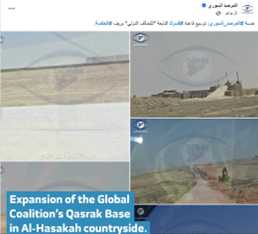 دیدهبان حقوق بشر سوریه (SOHR) بعداً، در ۲۸ سپتامبر ۲۰۲۵ (۶ مهر ۱۴۰۴) ویدئویی منتشر کرد که کاروانهای نظامی متعلق به ائتلاف جهانی را در حال حرکت به سوی پایگاه نشان میداد. همچنین در ۱۸ اکتبر ۲۰۲۵ (۲۶ مهر ۱۴۰۴) ، ویدئوی دیگری چندین کامیون ائتلاف حامل تجهیزات نظامی و لجستیکی را در مسیر از گذرگاه مرزی «الولید» به سمت پایگاه به تصویر کشید.