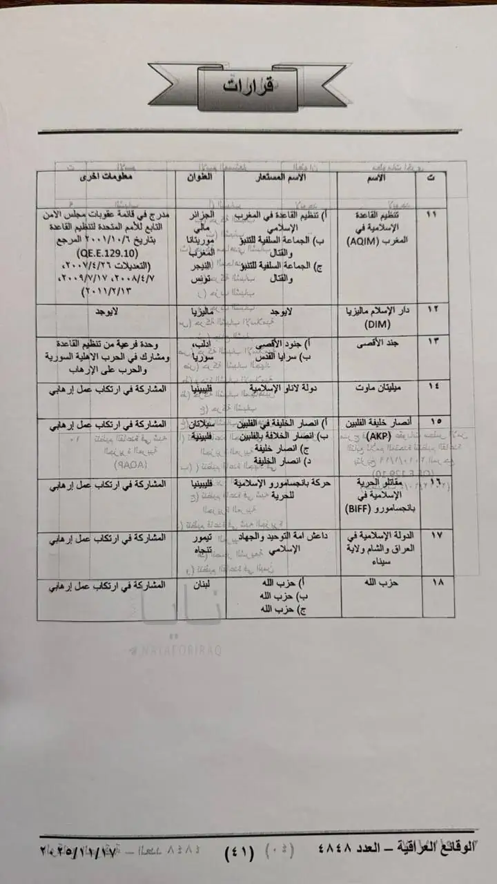 روزنامه الوقائع العراقیه تصمیم دولت عراق را که از سوی کمیته مسدودسازی اموال تروریستها صادر شده، منتشر کرد. این تصمیم شامل درج نام حزبالله لبنان و جنبش انصارالله یمن در فهرست گروههای تروریستی و آغاز روند حقوقی برای مسدودسازی منابع مالی آنها در عراق است.