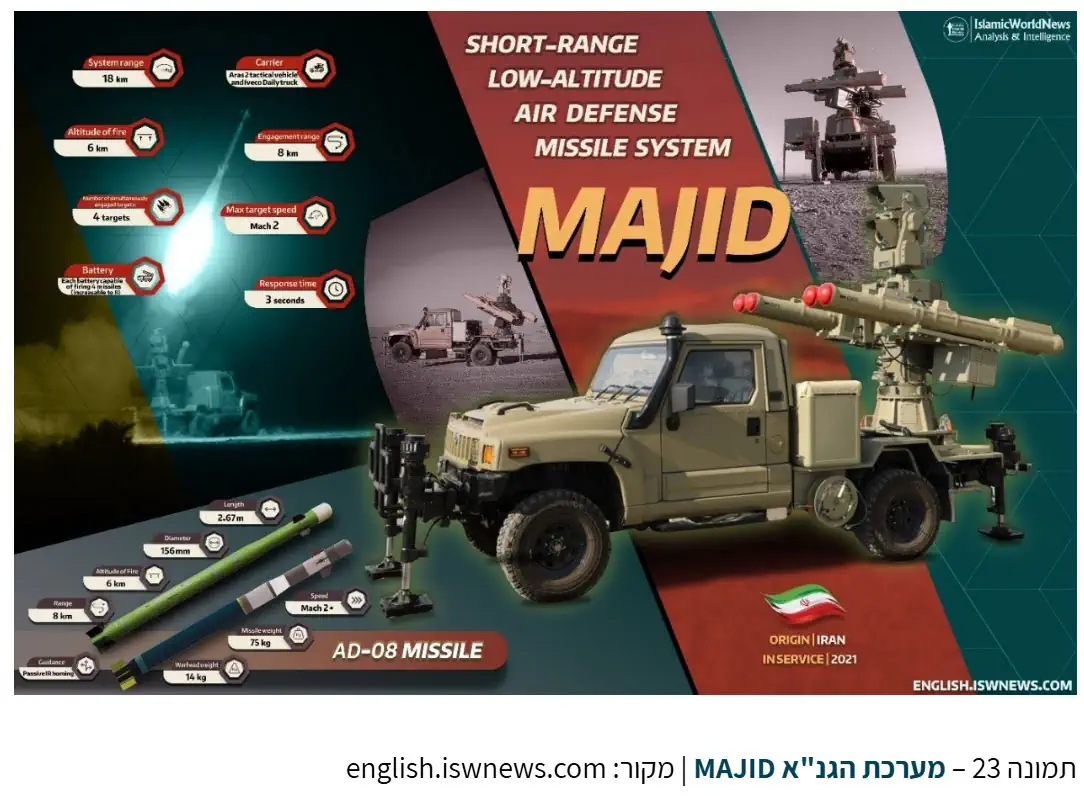 این موسسه با اشاره پرواز هواگردهای اسرائیلی و آمریکایی بر فراز ایران، نوشت: با وجود این آرایش گسترده، در جریان جنگ ۱۲ روزه، کارایی شبکه پدافند هوایی ایران بسیار محدود بود. بر اساس گزارشهای خارجی، نیروی هوایی اسرائیل و آمریکا توانستند بر فراز ایران پرواز کنند و اهدافی را مورد حمله قرار دهند اما دستکم دو فروند پهپاد اسرائیلی از نوع Heron و Heron-TP توسط سامانه برد کوتاه مجید ساقط شدند.