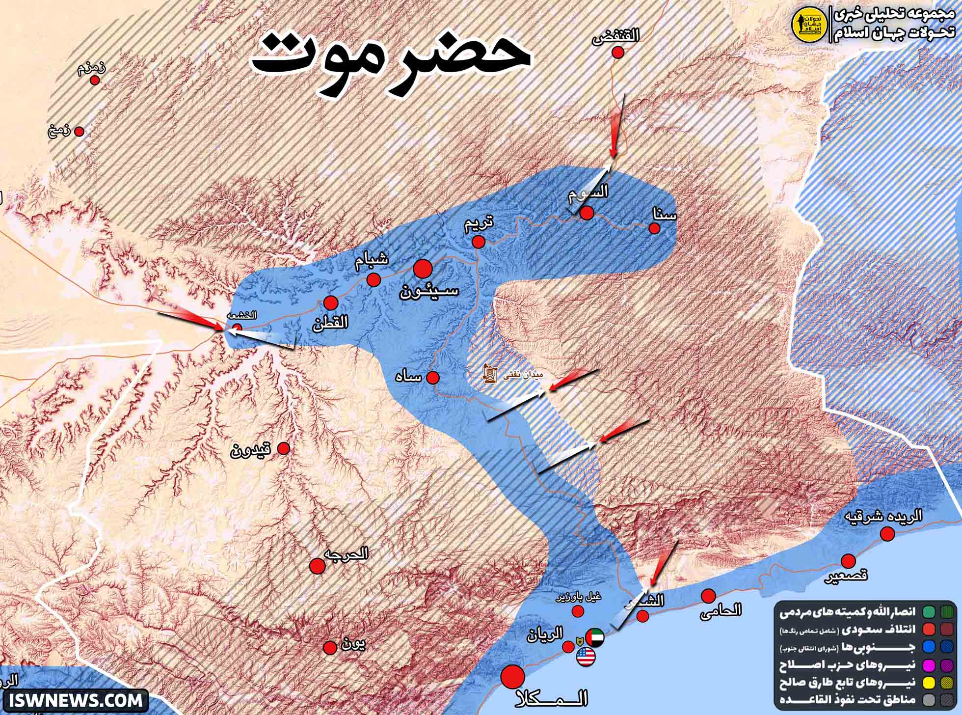 در استان حضرموت، خطوط درگیری در شمال حضرموت تغییری نکرده و منطقه الخشعه به عنوان خط درگیری واقع شده است و شهرهای القطن، تریم و سیئون در دره حضرموت همچنان در کنترل جنوبیها قرار دارد. نیروهای الدرع الوطن نیز به مناطق رماه و ثمود در صحرای شمال شرقی حضرموت رفته و در نوار مرزی بین یمن و عربستان مستقر شدهاند و احتمالا آماده حرکت به سمت شهرک السوم در جهت شرقی دره حضرموت هستند.