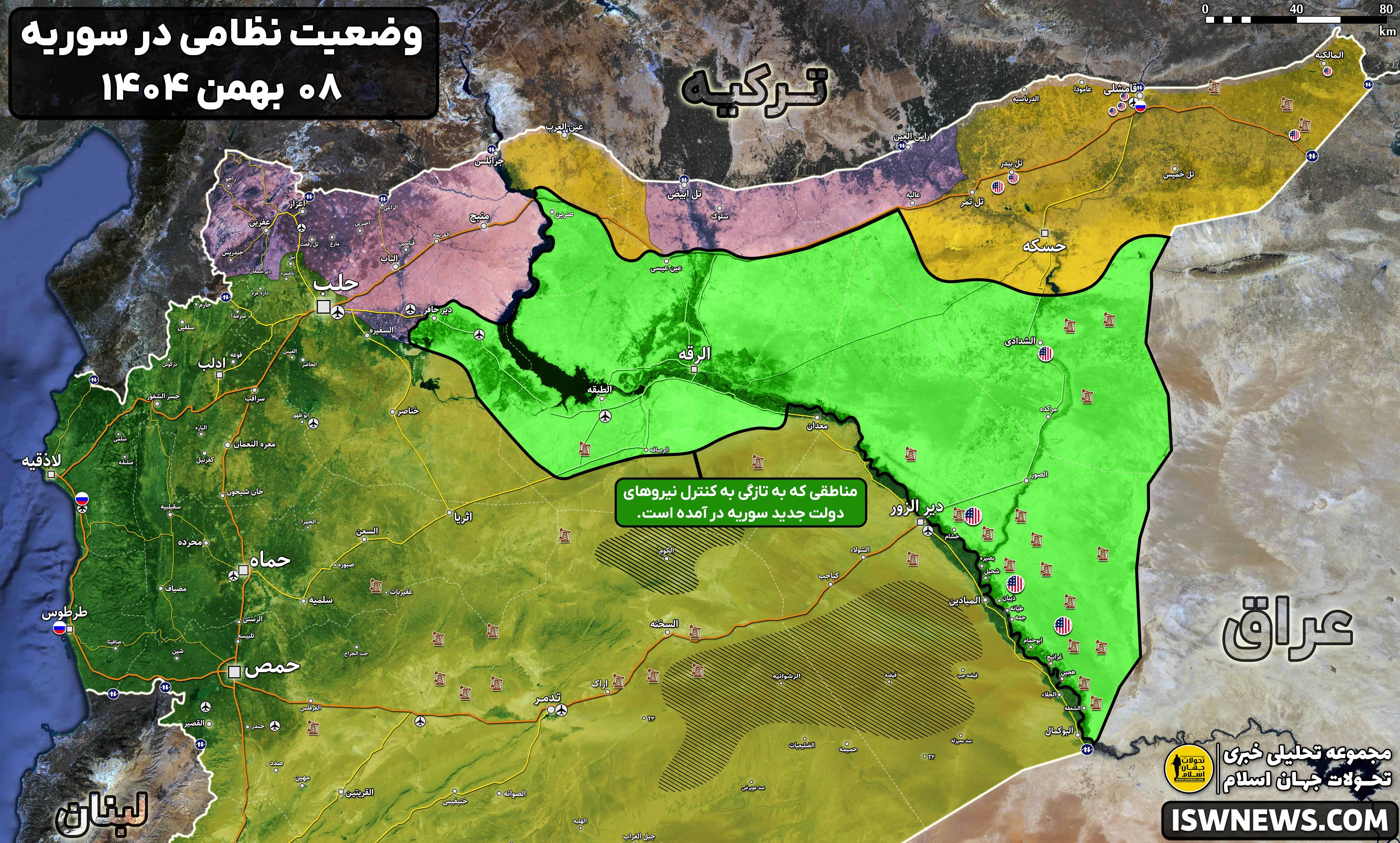بر اساس آخرین اطلاعات، نیروهای الجولانی پس از سلسله درگیری‌های پراکنده و در چارچوب توافق با SDF، مناطق مختلفی از جمله غرانیج، هجین، ابوحمام، درنج، میادین نفتی و گازی العمر، التنک و کونکو، الشحیل، ذیبان، مراط، خشام در استان دیرالزور، محله‌های شیخ مقصود و اشرفیه شهر حلب، مرکده و الشدادی در استان حسکه، عین عیسی، تل السمن و الجرنیه در استان رقه را تصرف کردند. اگرچه نیروهای الجولانی در ابتدای بهمن ماه مدعی ورود به منطقه تل حمیس در استان حسکه شدند اما ویدیو و تصاویر منتشر شده توسط منابع میدانی نشان می‌دهد که نیروهای SDF در این منطقه حضور دارند و نیروهای الجولانی عقب‌نشینی کرده‌اند.