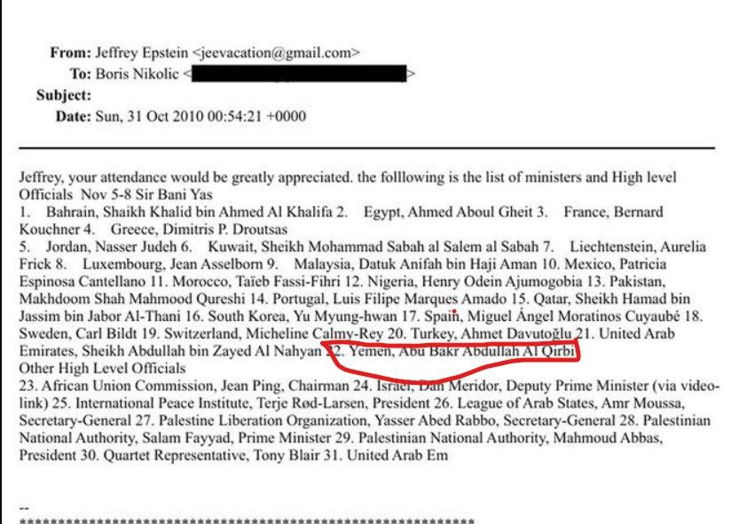 یکی از اسناد جدیدی که در آمریکا افشا شده، جلسهای است که ابوبکر القربی، وزیر خارجه یمن در زمان حکومت علی عبدالله صالح در سال ۲۰۱۰ میلادی در آن شرکت داشته و با جفری اپستین آشنا شده است.