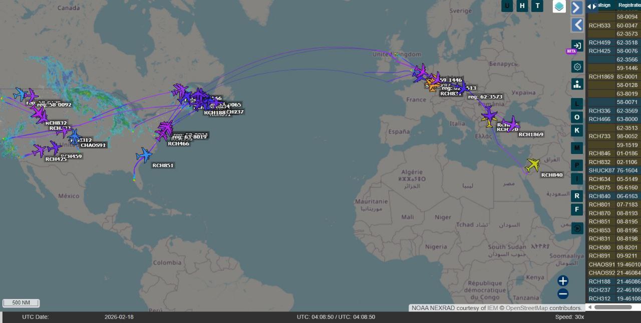 ۱- پرواز پنج فروند هواپیمای سوخترسان KC-135R/T «استراتوتانکر»، از پایگاه نیروی هوایی مکدیل در تامپا در ایالت فلوریدا، و شش فروند هواپیمای KC-135 Stratotanker و KC-46 Pegasus نیروی هوایی آمریکا به سمت اقیانوس اطلس و اروپا.