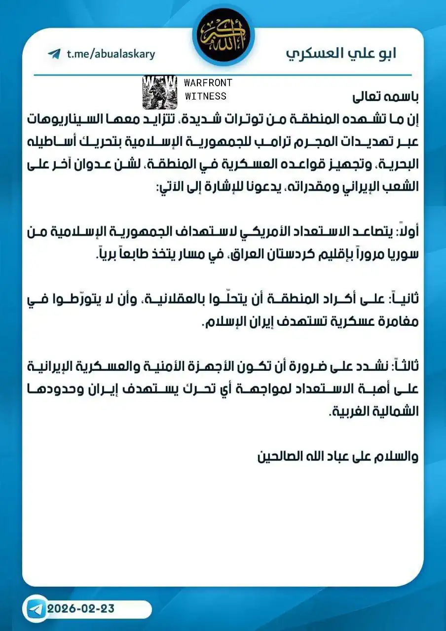 ابوعلی العسکری، مسئول امنیتی کتائب حزبالله عراق در پیامی با هشدار نسبت به افزایش تحرکات نظامی آمریکا در سوریه و منطقه کردستان عراق، اظهارداشت که این اقدامات در چارچوب آمادهسازی برای تجاوز به جمهوری اسلامی ایران و در امتداد یک «مسیر زمینی» در حال انجام است.