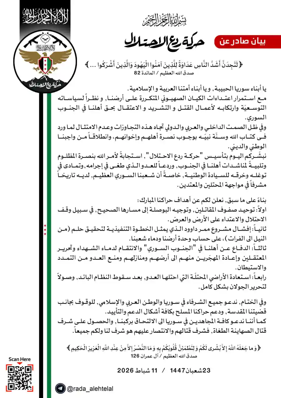 این جنبش در بیانیه منتشر شده در کانال تلگرامی خود اعلام کرده است که با اقدامات رژیم صهیونیستی در جنوب سوریه مقابله میکند و در راستای پایان دادن به بیعدالتی علیه مردم منطقه حوران (جنوب سوریه) و بازپسگیری مناطق اشغال شده توسط رژیم صهیونیستی فعالیت خواهد کرد.